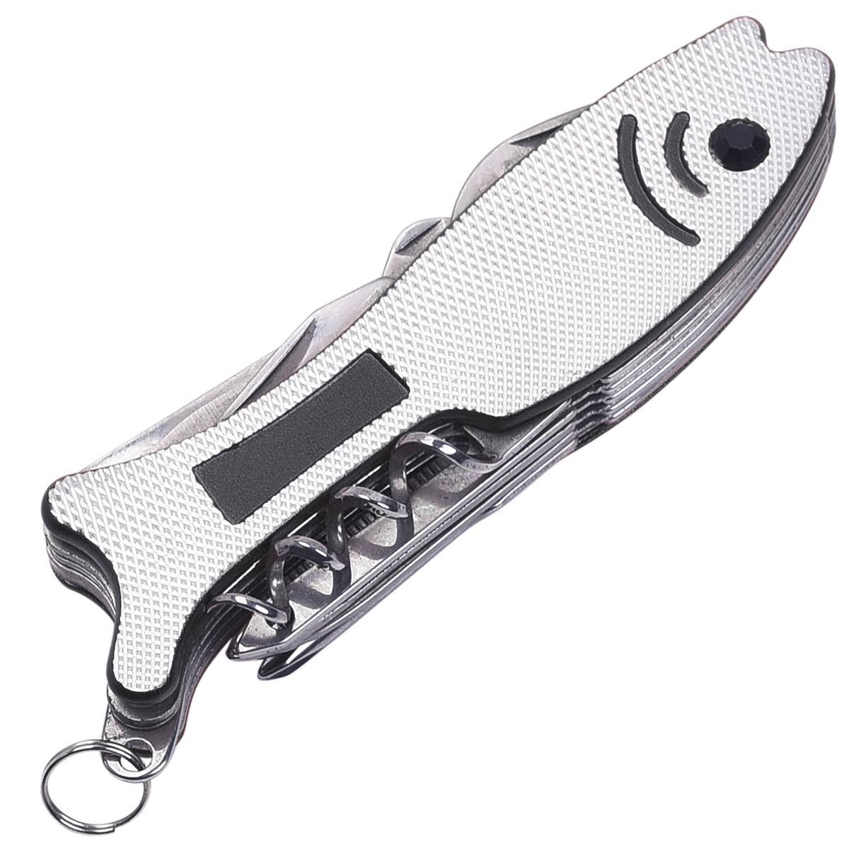 No tackle box needed for this awesome fish shaped multi tool! Saw, slice, cut, & file on or off the boat. Material: Stainless steel and alloy. Small & compact for easy pocket storage. Includes bottle opener & corkscrew wine opener. Phillip head screwdriver also included. Dimensions: 4" x 5".