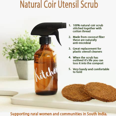 Say goodbye to having bits of steel and synthetic scrubs in your food. Check out our 100% natural scrub that is safe on coated utensils unlike steel scrubs and cleans better than anything plastic. Now in the traditional circular shape. Made using 100% naturally processed bristle coir fibre by artisans in India. 100% Natural, Scratch Free, Chemical-Free, Compostable and Biodegradable.