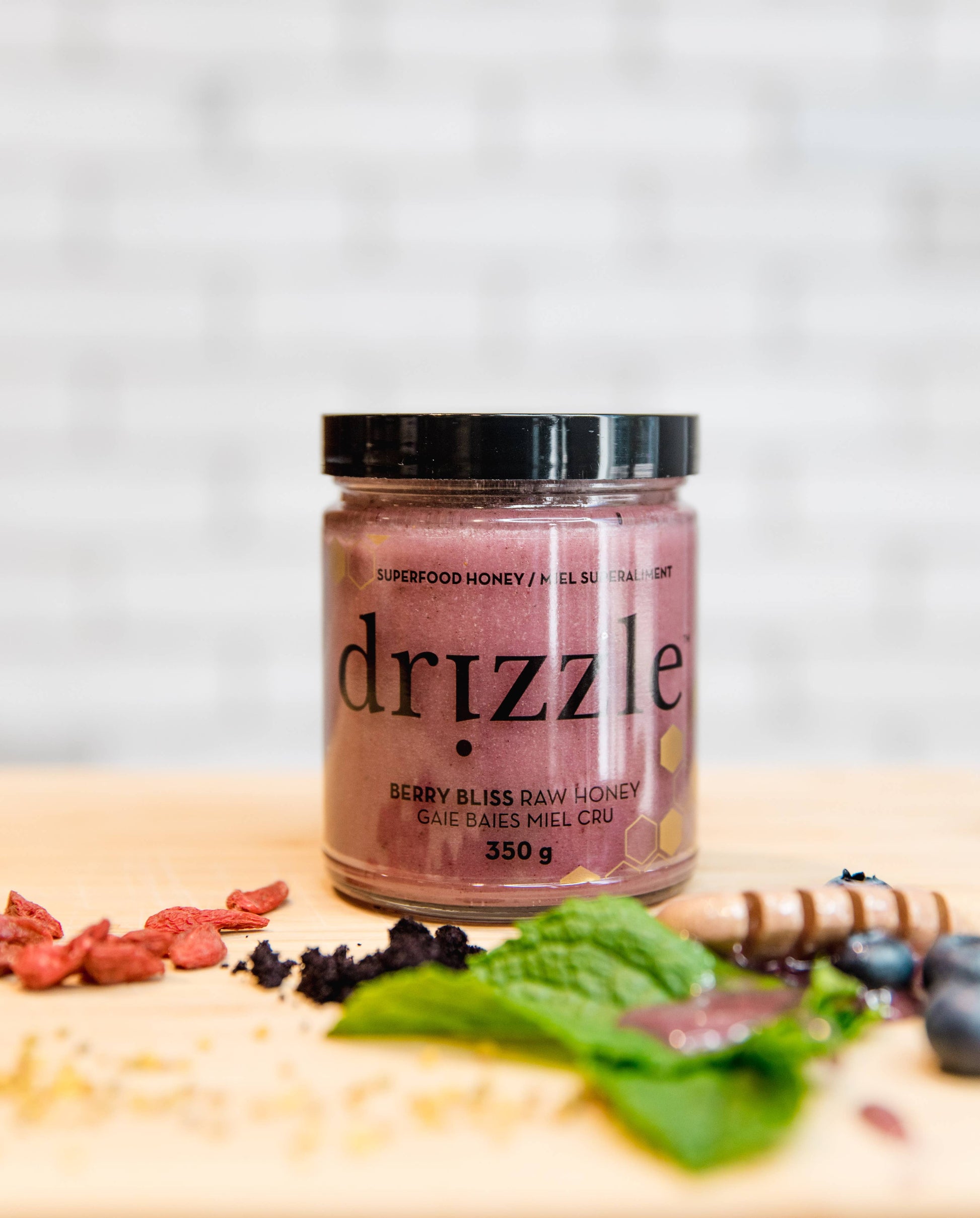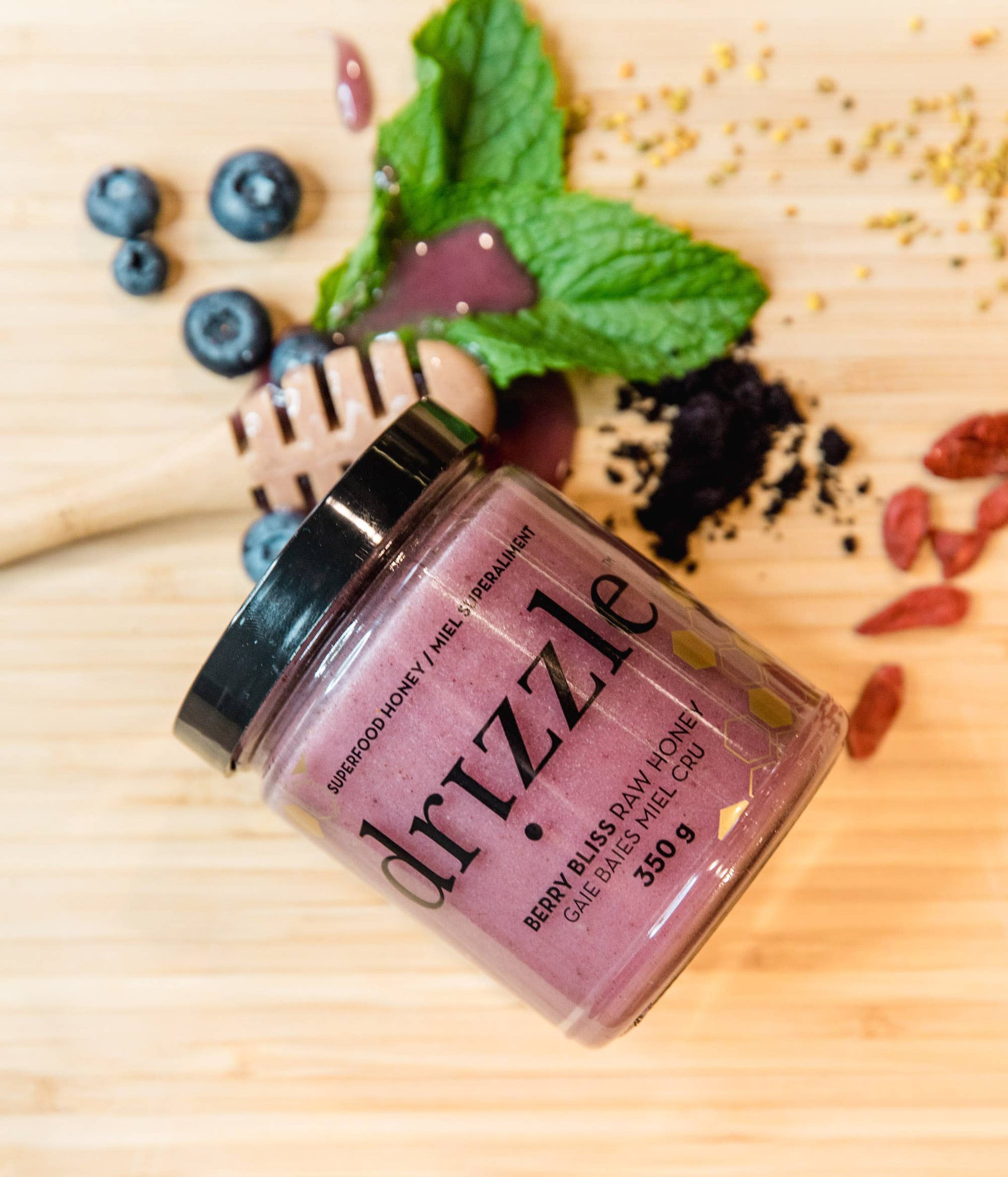 Lush, juicy and bursting with super berry goodness ( Organic Goji, Açai & Wild Blueberries & Blueberry extract). Drizzle Berry Bliss makes for a perfect, energizing addition to your day. Drizzle onto baked goods, blend into a vinaigrette or enjoy by the spoonful. Perfect for holiday gifting, stocking stuffers, corporate gifts, advent calendars, Christmas gifts and so much more! Delicious ways to enjoy: stir into tea or hot water, use in a vinaigrette, mix into smoothies, create a custom cocktail, honey berry compote, fresh fruit Popsicle, or drizzle over plain yogurt, the possibilities are endless! Drizzle Berry Bliss is part of our Superfood Honey Collection, and as always is bee-friendly, completely raw, health conscious and superfood powered! Drizzle is a Certified B Corporation and female founded. 350 g (12 oz)