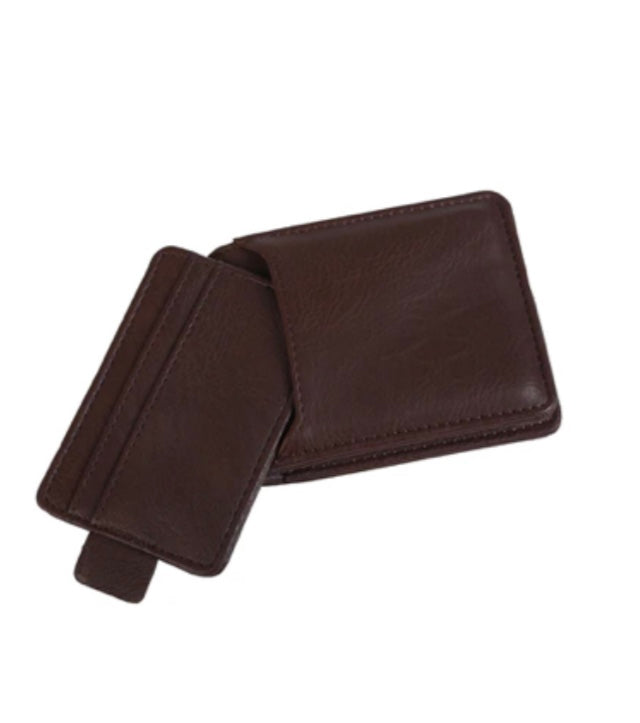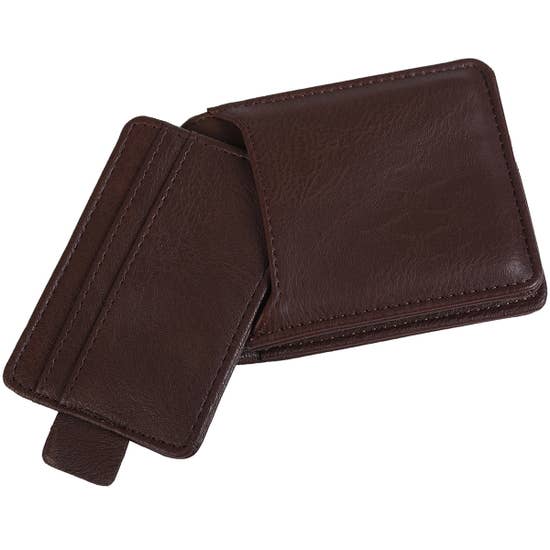 A billfold style wallet that has a special pocket encompassing a sleek credit card holder. Material: genuine leather. Holds up to 12 cards plus cash and i.d. Genuine grade leather with tough stitching. Removable mini wallet included. Dimensions: 4.75" x 1" x 3.5".