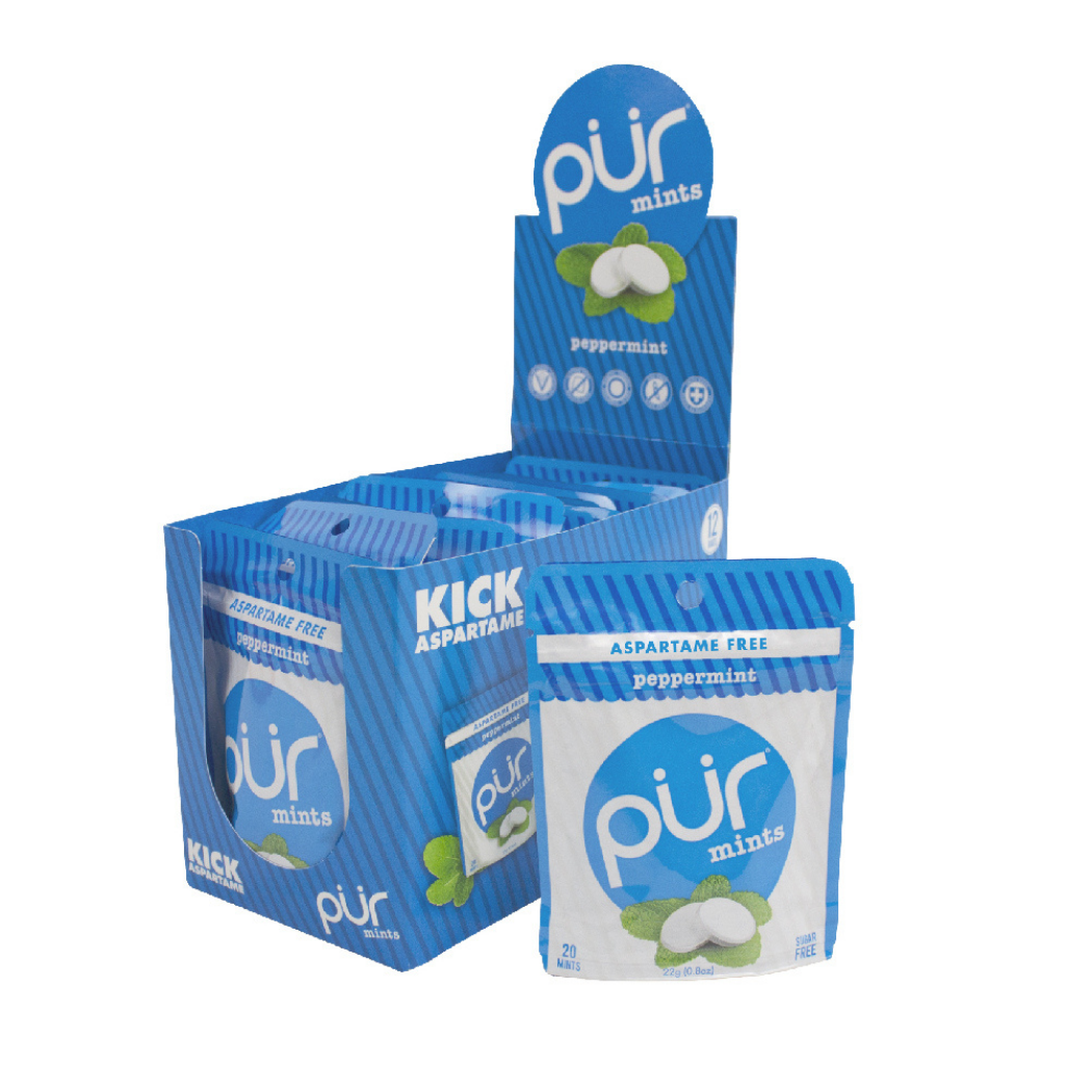 PUR 100% Xylitol Mints, Sugarless Peppermint, Sugar Free + Aspartame Free + Gluten Free, Vegan & Keto Friendly, These sugar free mints are refreshing & have a minty flavor to liven your taste buds. Keep your mouth feeling fresh with an intense burst of classic Peppermint flavor. Each mint pouch contains 20 pieces. Naturally sweetened with 100% xylitol PUR uses xylitol sustainably sourced from birch & maple trees grown in Finland. It looks & tastes just like sugar with 40% less calories than sugar while boosting oral health. Swiss-made All our ingredients are sourced from Europe and made in Switzerland. PUR is a quality first brand.
