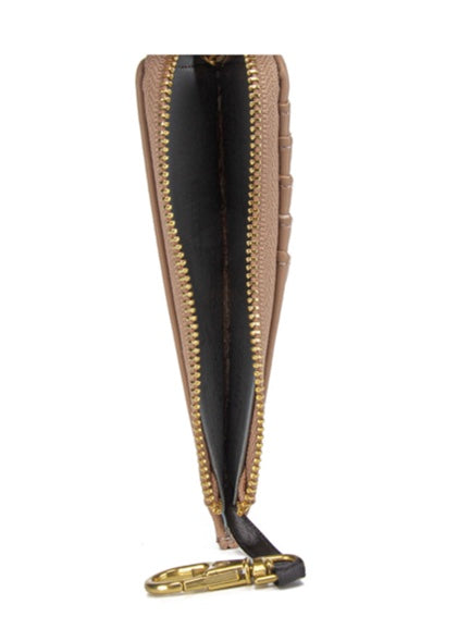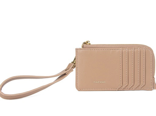 Slim profile card holder with five card slots and a ziparound coin compartment. Now includes a wristlet strap!