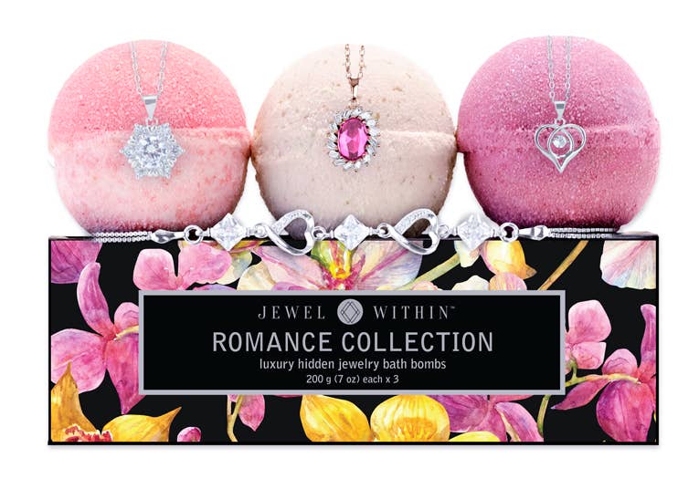 Indulge in the sensual, modern and edgy aromas from our Romance Jewelry Bath Bomb Collection. These bath bombs are loaded with natural, moisturizing coconut and apricot kernel oils. They smell simply amazing and produce a rich foam for the bath. Uncover a 925 sterling silver jewelry item in that’s hidden inside one of the three bath bombs. Encased in protective bag and water-resistant capsule will be either a necklace, bracelet, pair of earrings or a ring. This set contains: Cashmere & Roses Bath Bomb– The delicate aroma of modern, feminine, soft sweet roses. Vanilla Jasmine Bath Bomb – A classic rich and warm vanilla with a tiny hint of jasmine. Playful Passion Flower Bath Bomb – A sophisticated, modern and edgy floral with a notes of passion fruit. Key Features: Three bath bombs, 1 bath bomb in the set includes a jewelry piece, 100% Vegan, handmade, natural ingredients, paraben & SLES free, no animal testing. Made in Canada