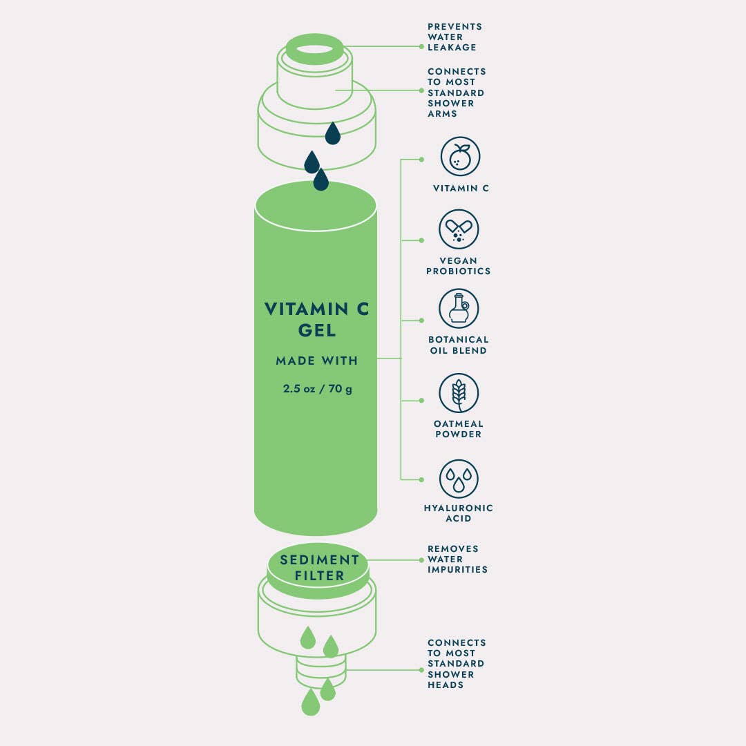 Vitamin C removes residual chlorine and other impurities from hard water to rejuvenate your skin and condition your hair, one shower at a time. Vegan probiotics strengthen and regenerate the skin barrier, while oatmeal powder softens and soothes for healthy, glowing skin. This shower filter gives a whole new meaning to clean. It will be the best shower you’ll ever take!